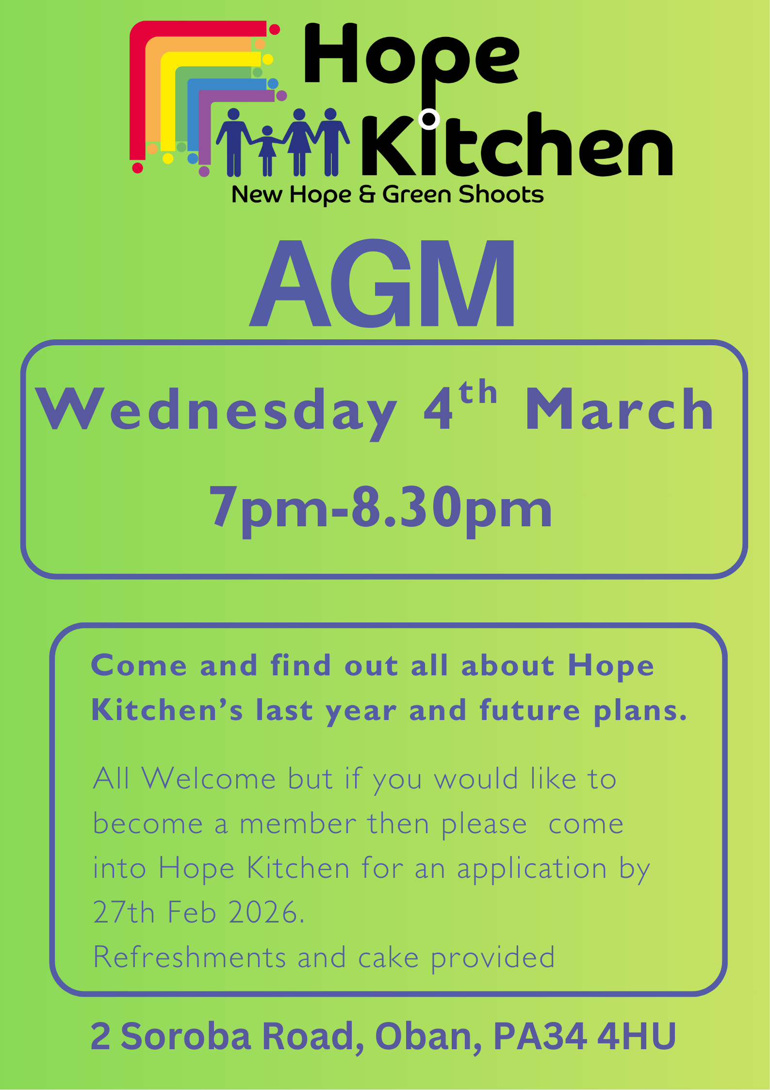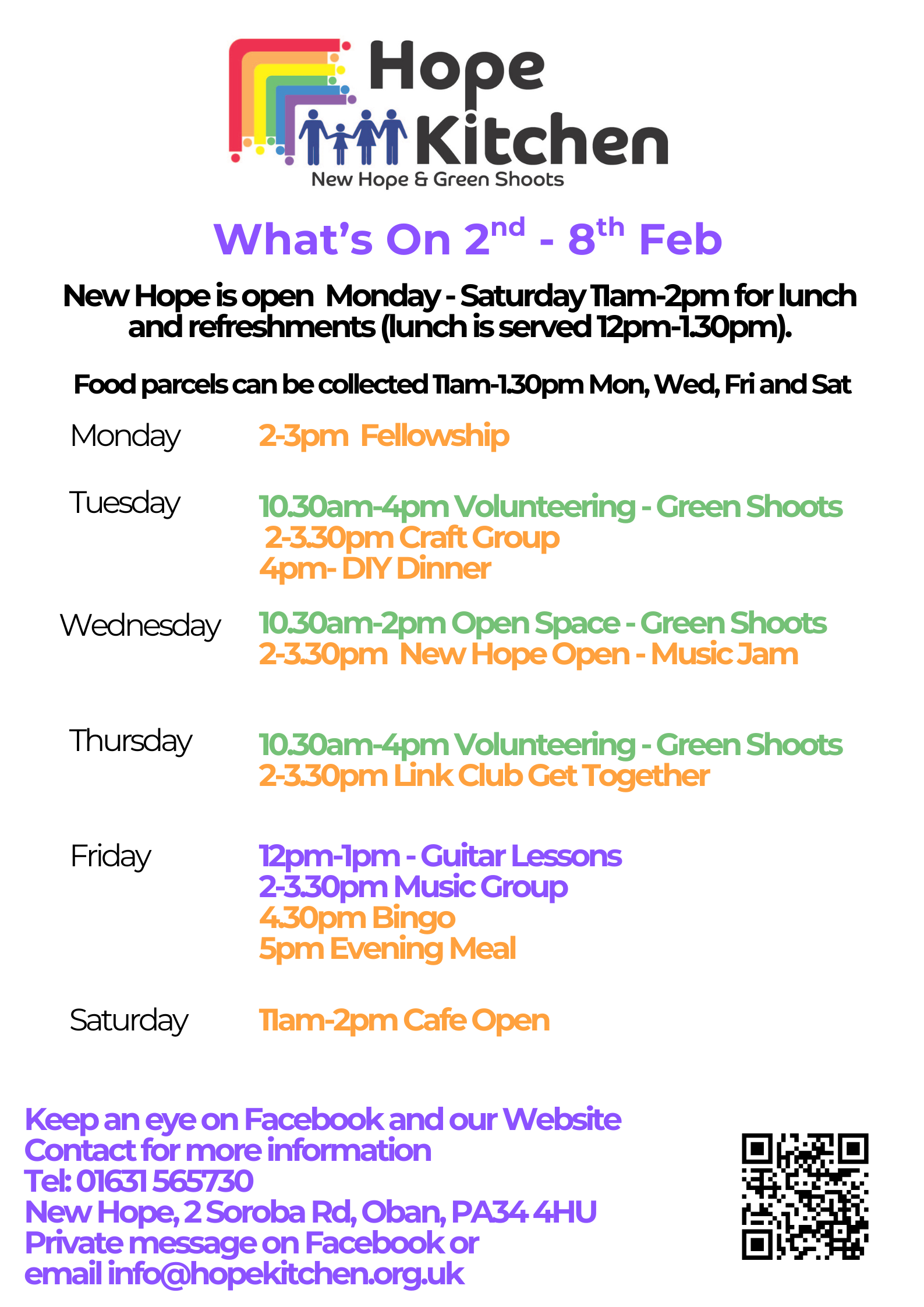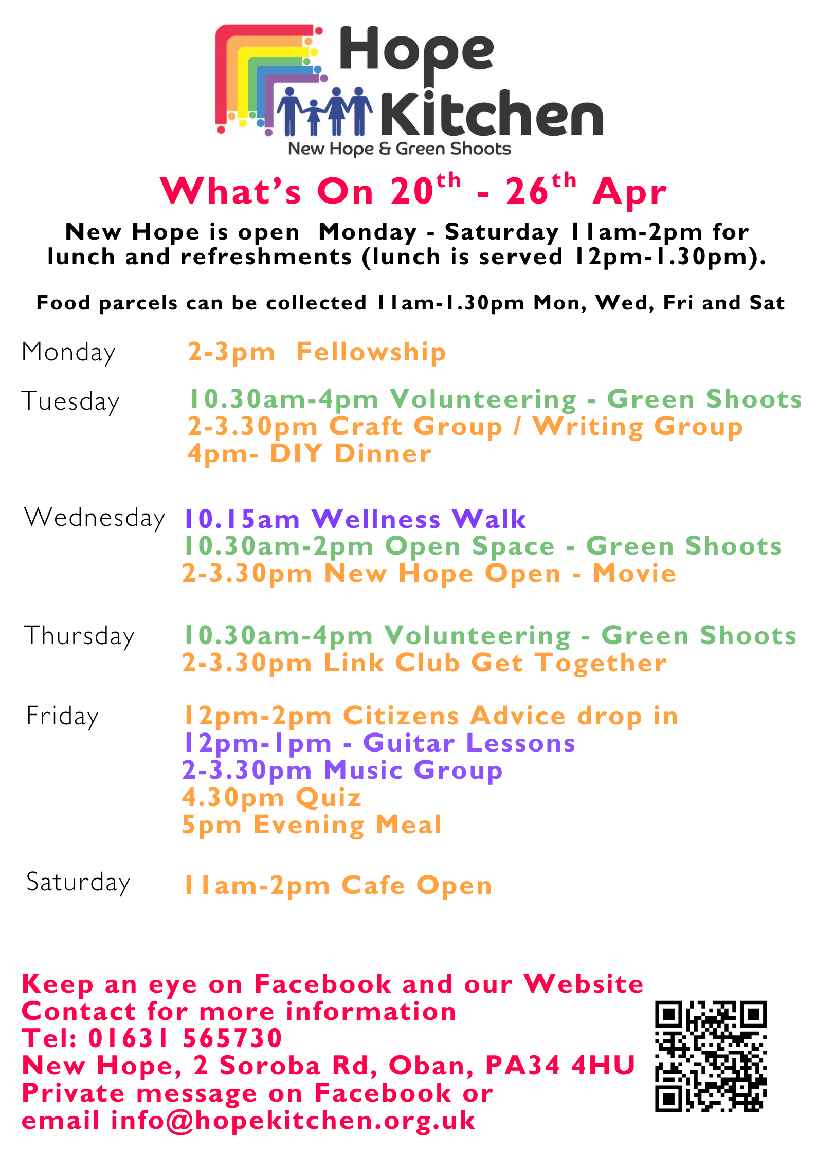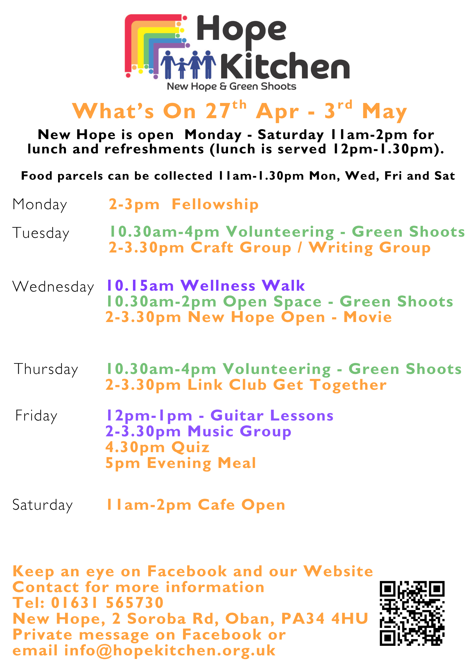 Hope Kitchen is a local charity that aims to serve Oban, Lorn and the Isles. Hope Kitchen comprises New Hope community Cafe, re_store community shop and Green Shoots Community garden.